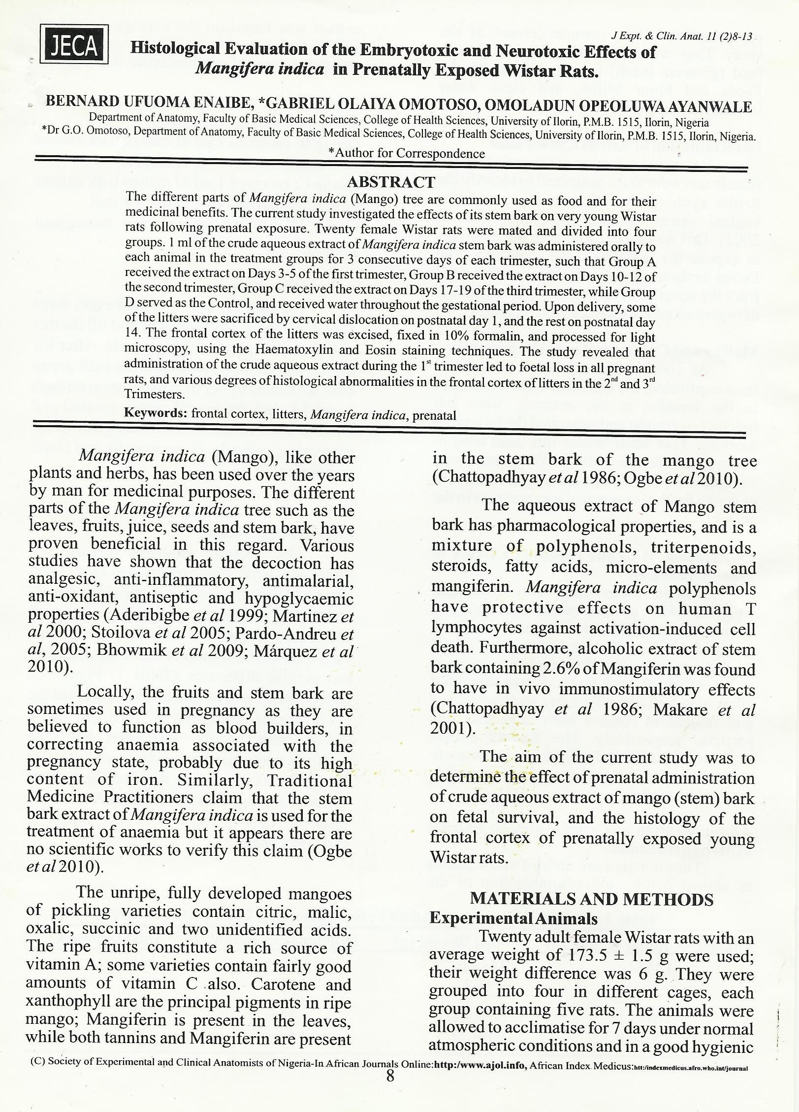 Histological evaluation of the embryotoxic and neurotoxic effects of Mangifera indica in prenatally exposed Wistar rats