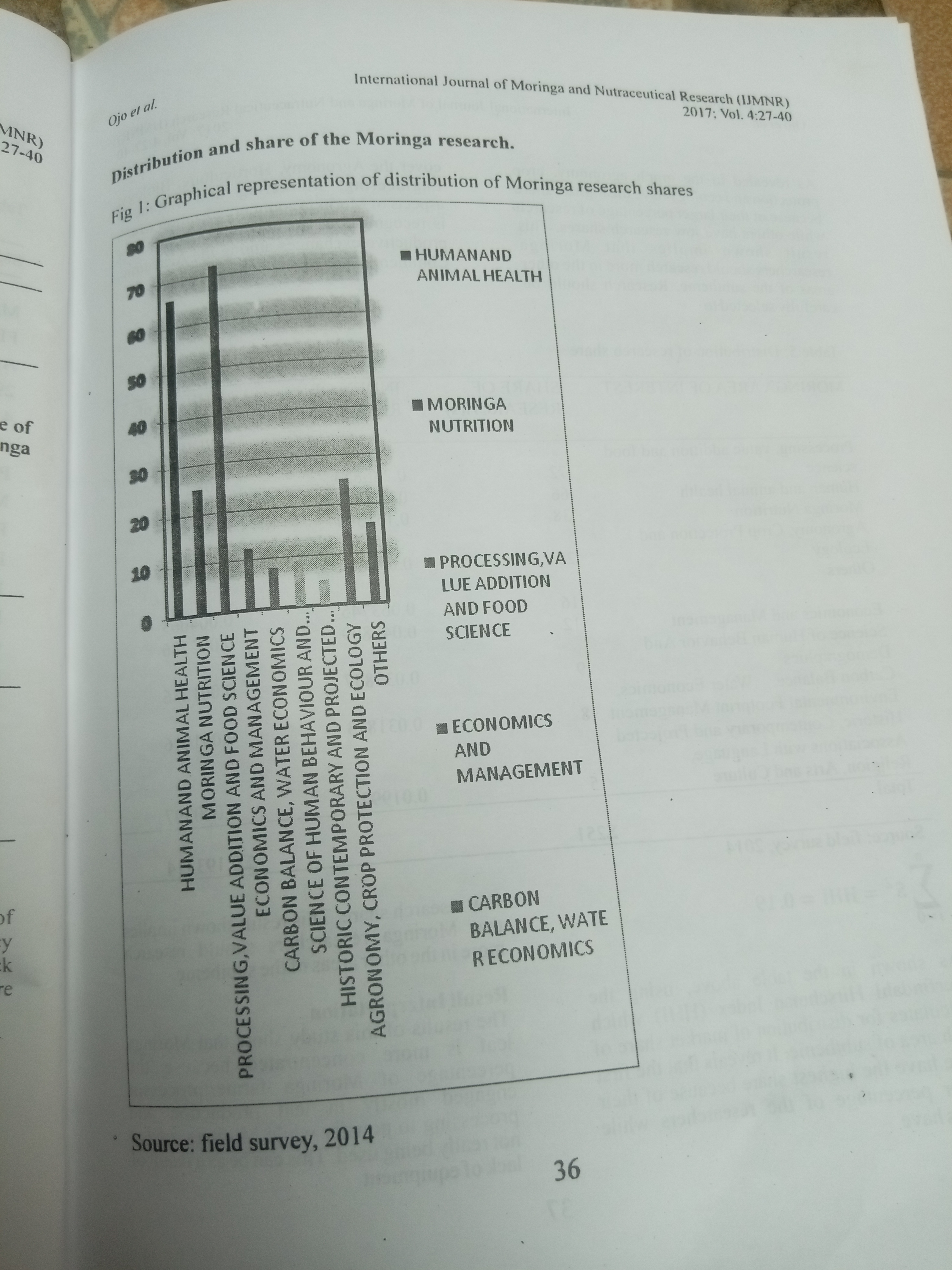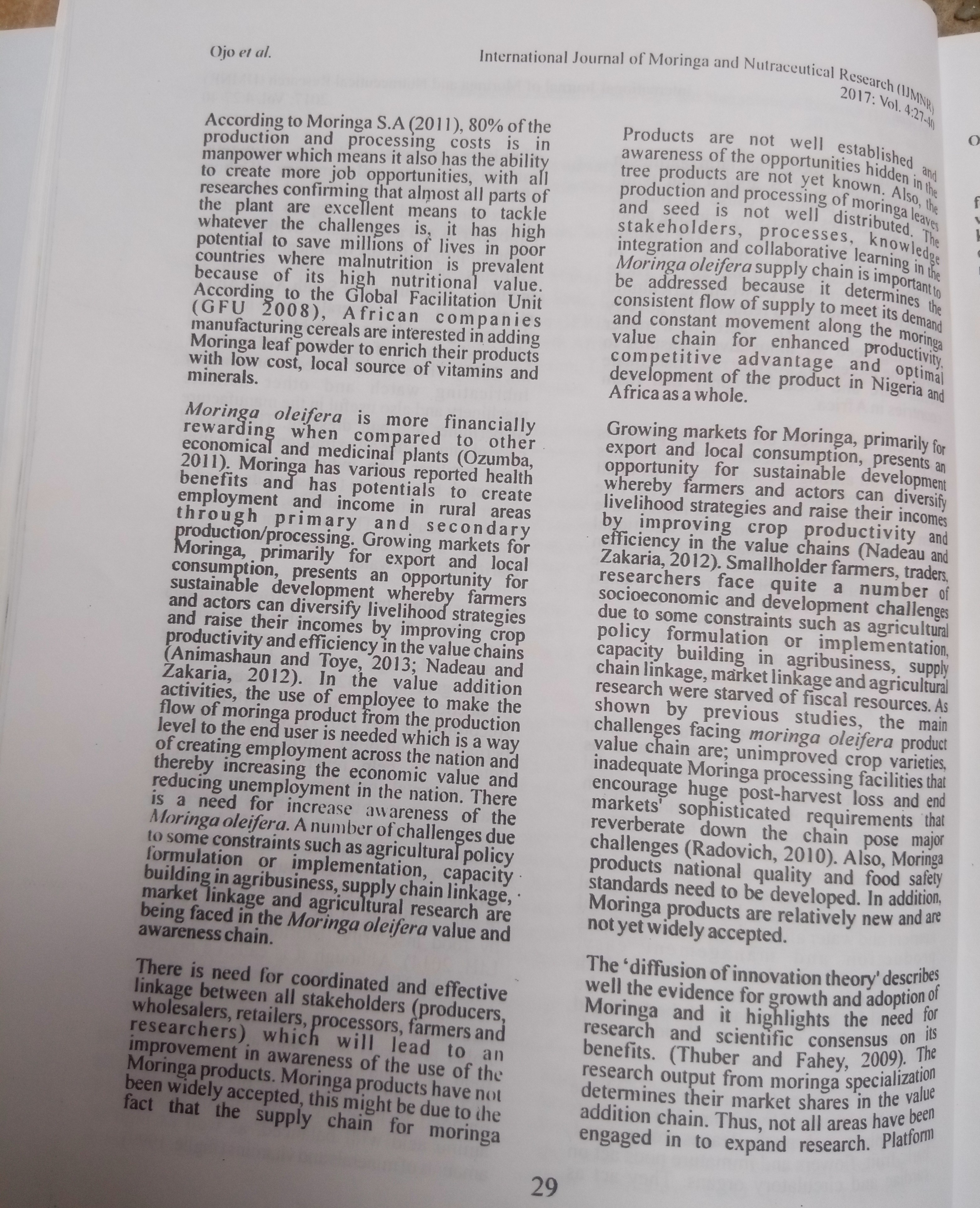 Africans have always been said to be a distinct and endowed race, one of the reasons is becue of our indigenous and unparalleled knowledge in the use of plant and herbs as food and medicine even before the aluminance of foreign made drugs and products which have threatened to reduce the knowledge heritage and ute of African discovered plants The Moringa oleifera plant is a very special plant because of its many abilities. It has potential to reduce high rate poverty, malnutrition inadequate health care suppis poor nutrition, low income level and food insecurity in Africa. There is a need to boost the kwwledge and usage of different plants which were used by African forefathers but have been lost over the years. The study was conducted in Nigeria, which is the most populated country in Africa. In Nigeria there is an increasing, but not enough, awareness of the different opportunities and sues of the Moringa oleifera tree, hence, the reason for this study. The study was conducted through the use of well-structured questionnaires. The stul ured The Herfindahl Hirschman Index () to analyze the distribution and market share for moringa leaves and seed among farmer/processors actors and to examine the distribution and market shares of research institutes across the Moringa value chain. The study revealed that the market share of leave was concentrated compared to thatof seed. The following recommendations were made; there is a need for different institutes and research bodies to involve themselves in more production innovation and research on Moringa to boast it use and improve the country's health care and food security, and conrequently Africa as a whole. In addition, the creative African apirvt should be channeled to create better processing and innovative methods for value additions and processing of Moringa products