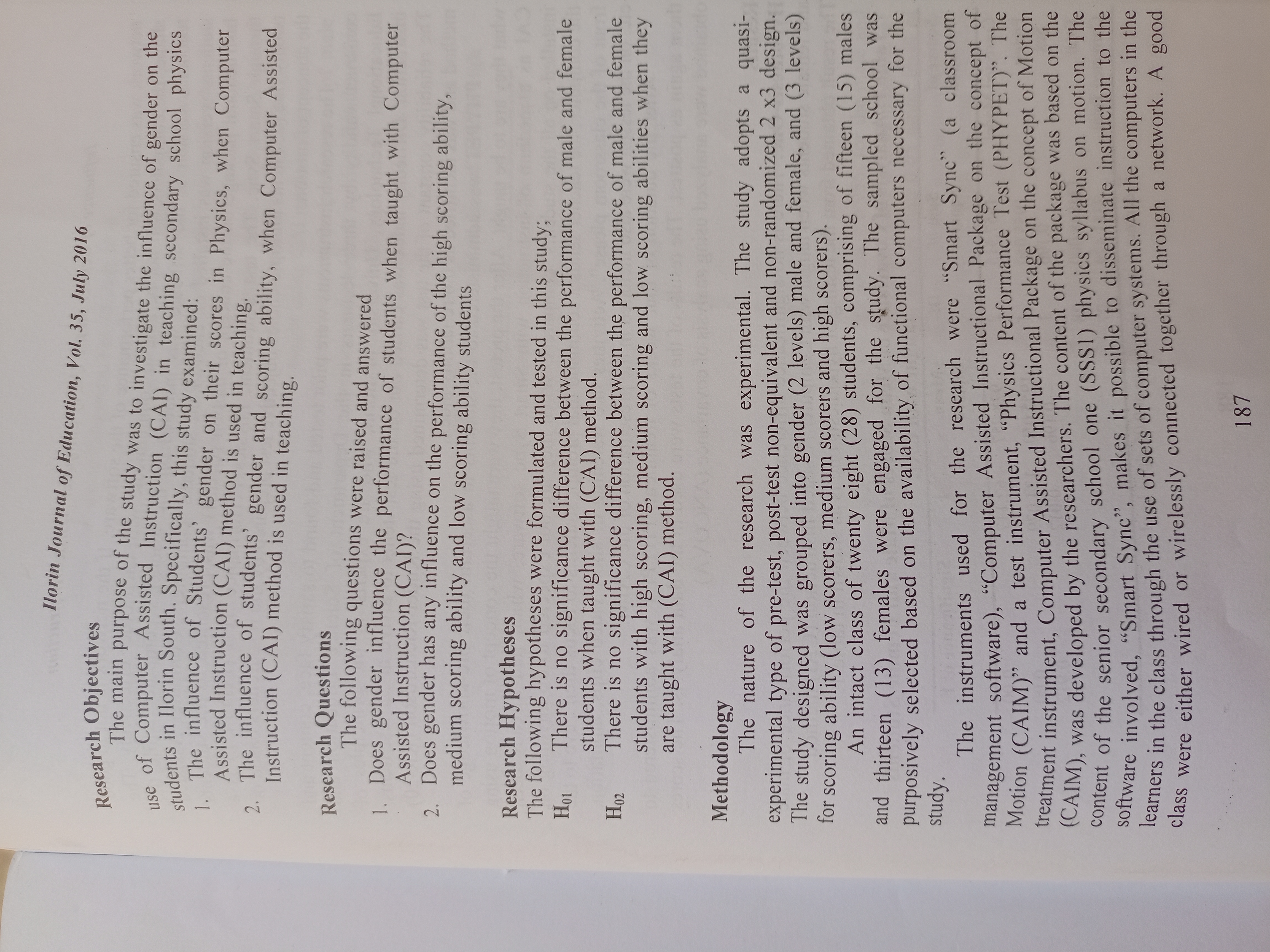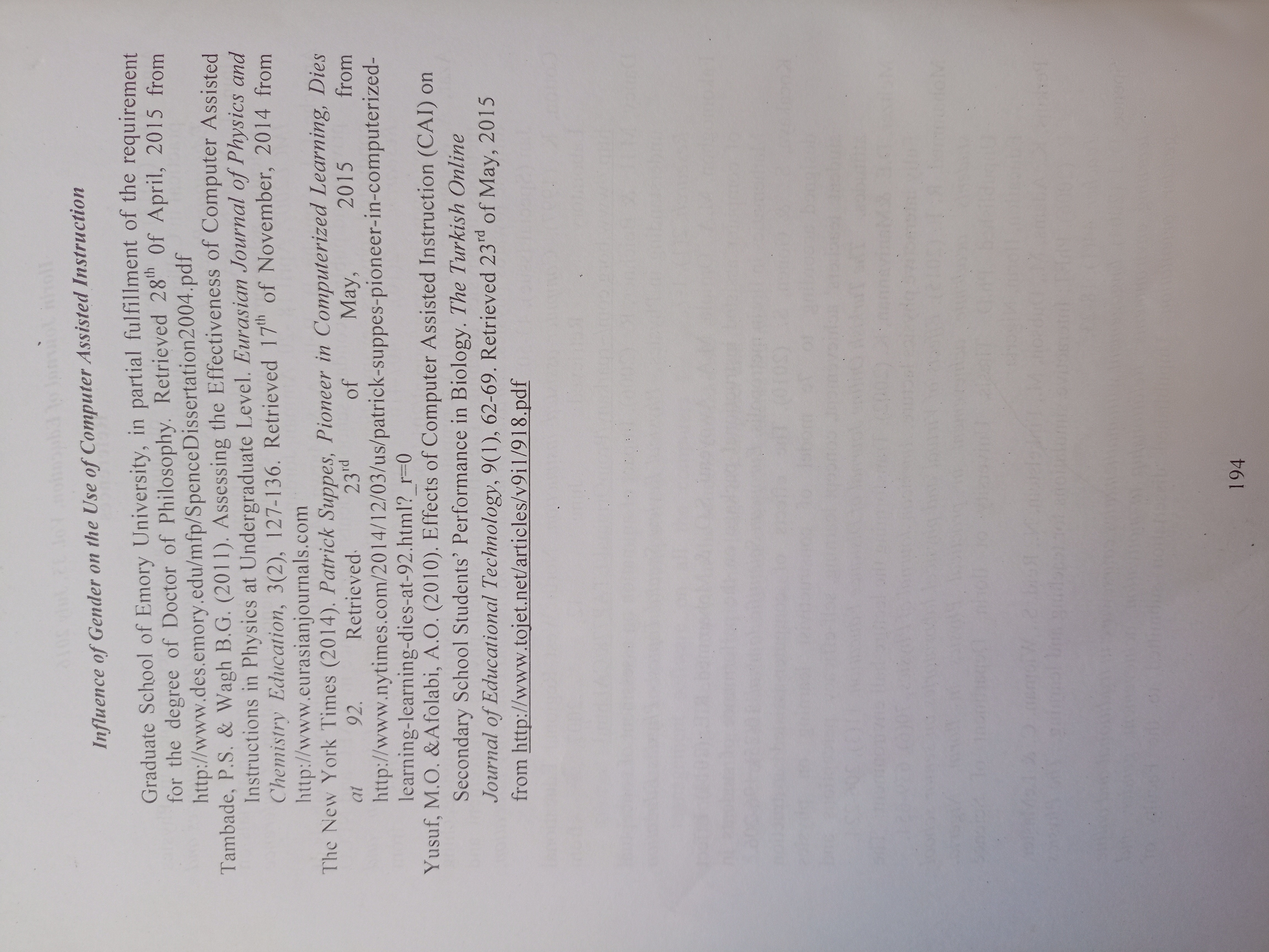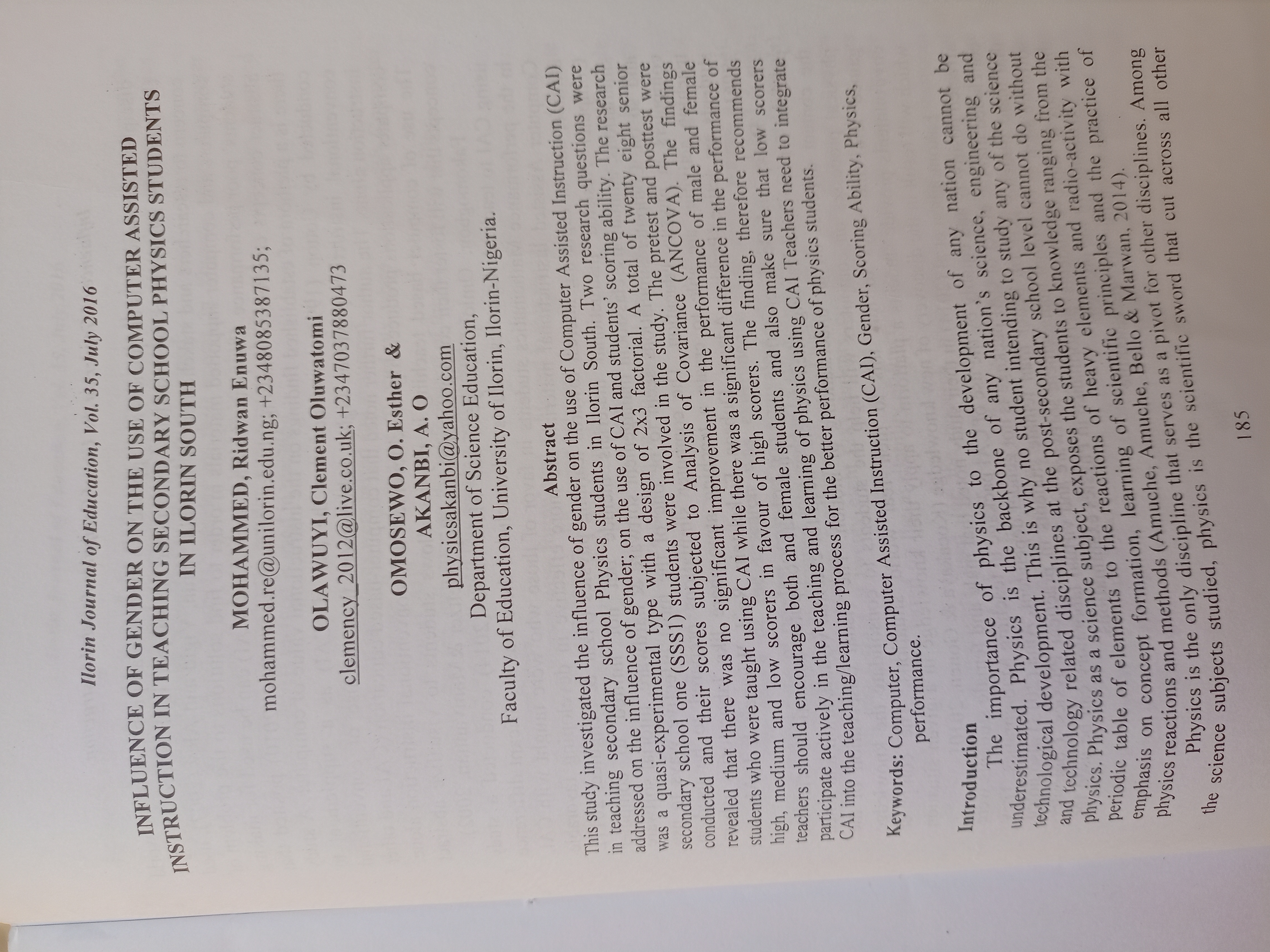 Mohammed, R. E., Olawuyi, C. O., Omosewo, E. O. & Akanbi, A. O. (2016). Influence of Gender on the use of computer assisted instruction in teaching secondary school physics students in Ilorin South. Ilorin Journal of Education (IJE);35(1) 185-194