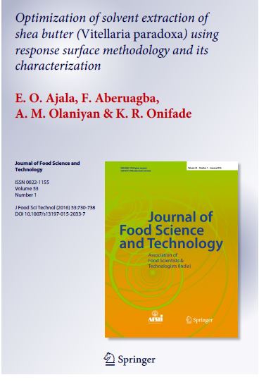 Ajala, E.O, Aberuagba, F., Olaniyan, A. M. & Onifade, K. R. (2015): Optimization of solvent extraction of shea butter (Vitellaria paradoxa) using response surface methodology and its characterisation. Journal of Food Science and Technology, 53(1): 730 – 738. Published by Springer Association of Food Scientists and Technologists of India (AFSTI) Available online at http://link.springer.com/article/10.1007/s13197-015-2033-7