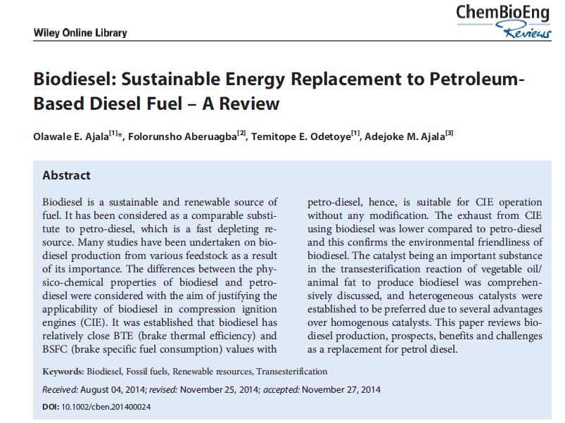 (15) Ajala, E.O., Aberuagba, F., Odetoye, T. E. & Ajala, A. M. (2015): Biodiesel: Sustainable Energy Replacement to Petroleum-Based Diesel Fuel– A Review. ChemBioEng Reviews, 2(3): 145 -156. Published by Wiley Library. doi: 10.1002/cben.201400024. Available online at http://onlinelibrary.wiley.com/doi/10.1002/cben.201400024/abstract