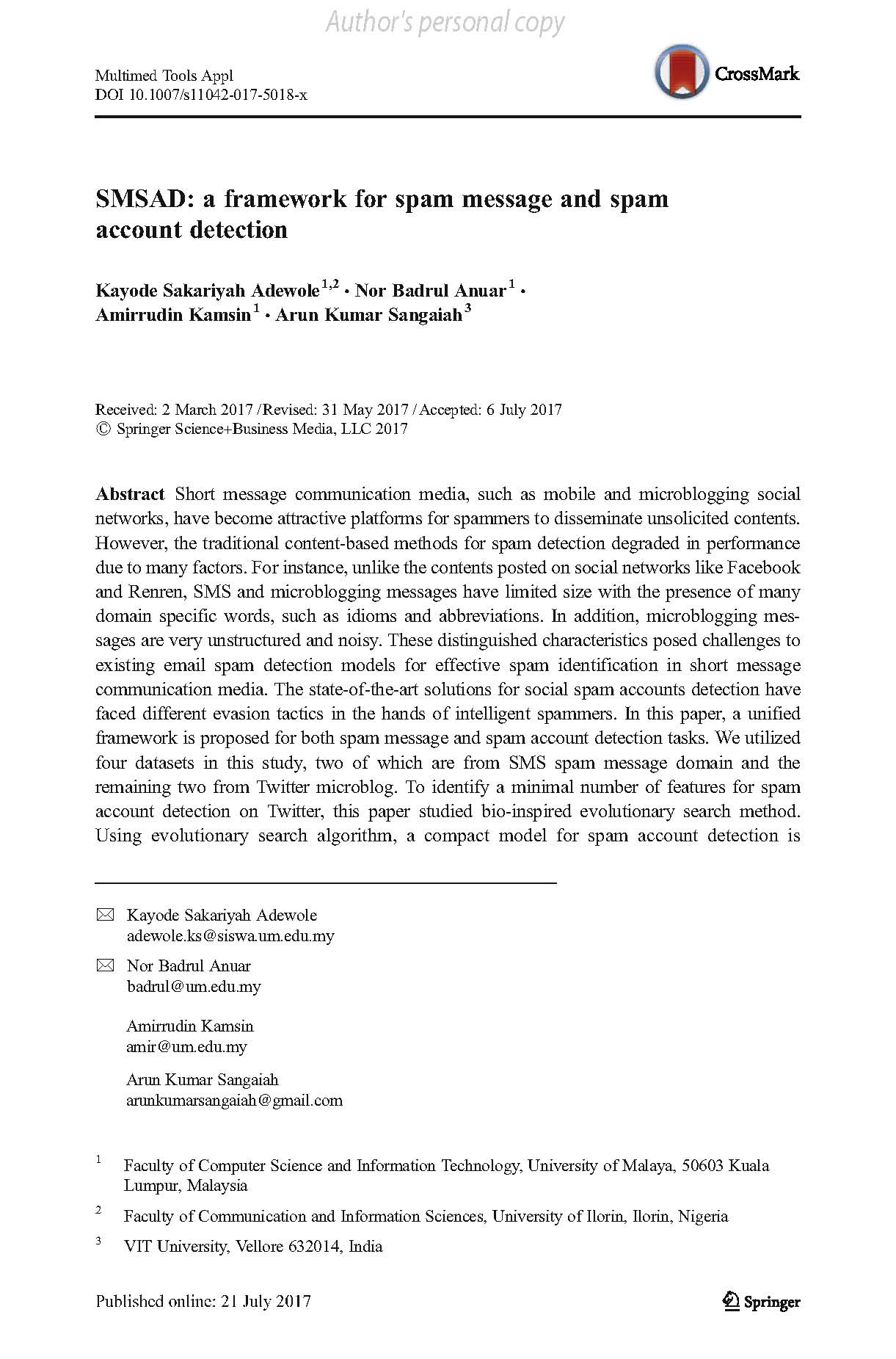 Online social network; Microblog; Spam message; Spam account; Evolutionary computation; Machine learning